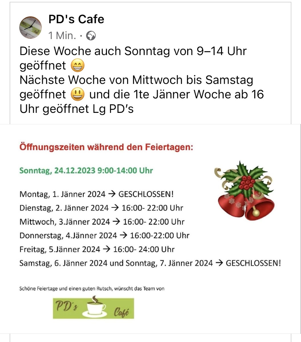 Welcome to PD's Cafe, a delightful spot nestled at Ungarstraße 26, Hainburg an der Donau, Austria. This charming cafe offers an inviting atmosphere, perfect for casual gatherings or a quick coffee break. Customers rave about the remarkable menu, featuring not only decaffeinated options but also an array of delicious pastries, including their famous sachertorte. Gina Kiss mentions the delectable baguettes, while Rastislav Pavlík commends the cafe as a checkpoint for beer and cake. The warm service enhances the experience, as noted by Dominik Hreus, despite minor service hiccups highlighted by others. PD's Cafe stands out as a local favorite, attracting patrons of all ages, even if it leans toward the senior crowd at times. With its great prices and wholesome offerings, PD's Cafe invites you to relax, indulge, and enjoy a taste of comfort in every bite. Don’t miss this gem when you visit!